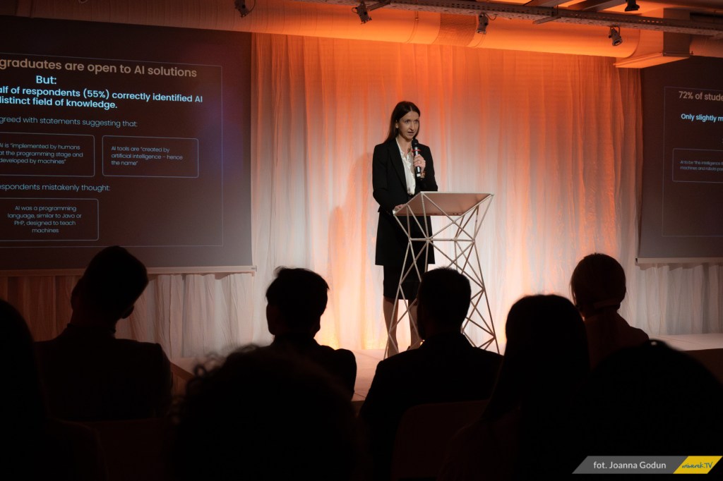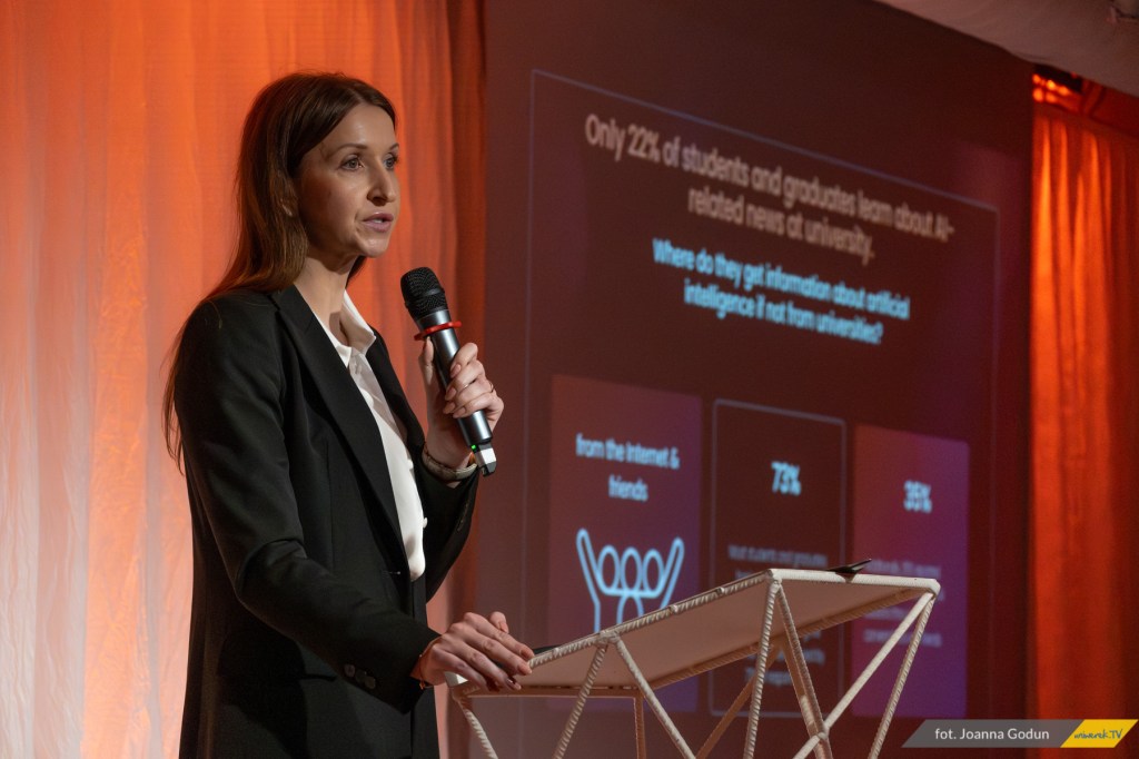 – Musimy wiedzieć, kiedy sztuczna inteligencja jest przydatna: do szkicu, burzy mózgów i generacji pomysłów. Tymczasem pamiętajmy o tym, aby rozumieć jej ograniczenia, takie jak stronniczość czy luki w danych, co możliwe jest poprzez reverse prompting, weryfikację danych i humanizm. (…) Efektywne korzystanie oznacza pracę z AI, a nie dzięki niej. Należy być liderem procesu, a nie przyglądającym się. Twórcą, a nie kukłą. Młodzi ludzie często mówią, że musimy podążać drogą sztucznej inteligencji. To nieprawda, jesteśmy pasywni podczas jazdy nią. My musimy STWORZYĆ tą drogę”. – zaznaczyła Litwinka.