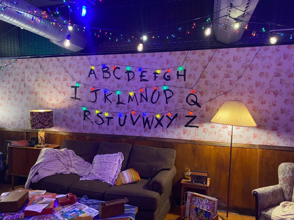 Na pierwszym piętrze, idąc od prawej, zwiedzanie rozpoczynał salon rodziny Byersów, gdzie odtworzono słynną ścianę z lampeczkami i alfabetem, które są znakiem rozpoznawczym „Stranger Things”. Każdy centymetr wolnej przestrzeni na meblach był zapełniony rekwizytami – nawet szuflady w szafkach miały gadżety inspirowane serialem, co pokazuje z jaką starannością i dokładnością została odtworzona sceneria.