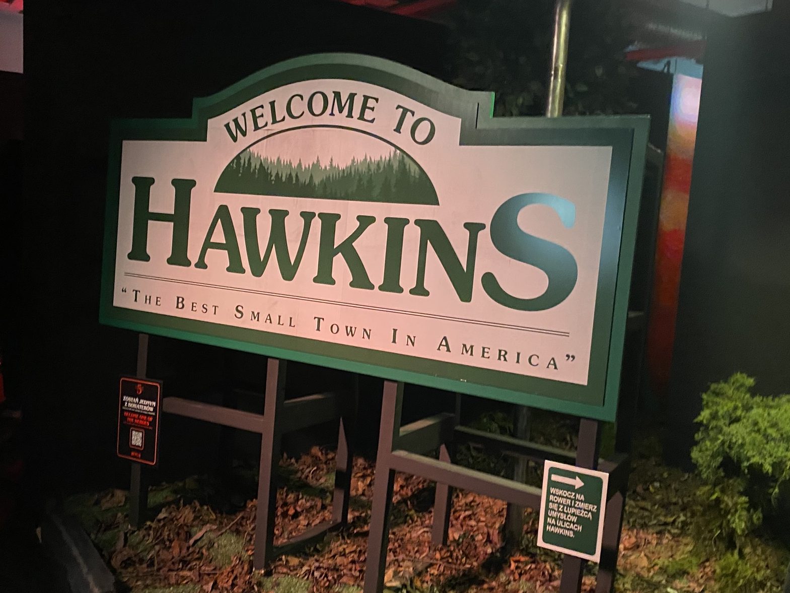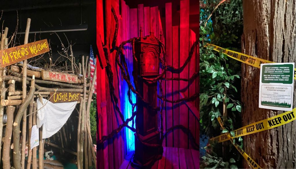 Drugie piętro otwierało dużo ciekawsze możliwości. Mogliśmy przejść korytarzem, który był stylizowany na wnętrze umysłu Vecny – pnącza i czerwone światła oplatały przejście do słynnego zegara, który znajdował się na końcu, czyli na strychu Creelów. Oprócz tego, w pomieszczeniu czekała nas gra z technologią kinect, która polegała na walce z Vecną, czyli dynamicznym przecinaniu gałęzi, by odeprzeć jej atak. Nic szczególnie zaawansowanego, ale był to intrygujące urozmaicenie doświadczenia. Najbardziej obleganą atrakcją była Mroczna Puszcza, w której trzeba było odnaleźć Willa wraz z grupą losowo dobranych przyjaciół. Była do niej niekończąca się kolejka, więc dostanie się do środka nie było łatwe i nam akurat się nie udało. Przed wejściem do puszczy znajdował się zamek Byersów, czyli drewniany fort wybudowany przez Willa i Jonathana, w którym można było zrobić sobie zdjęcie.
