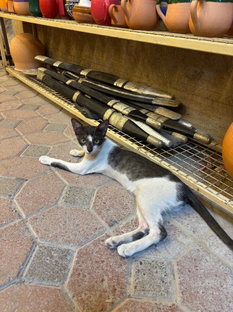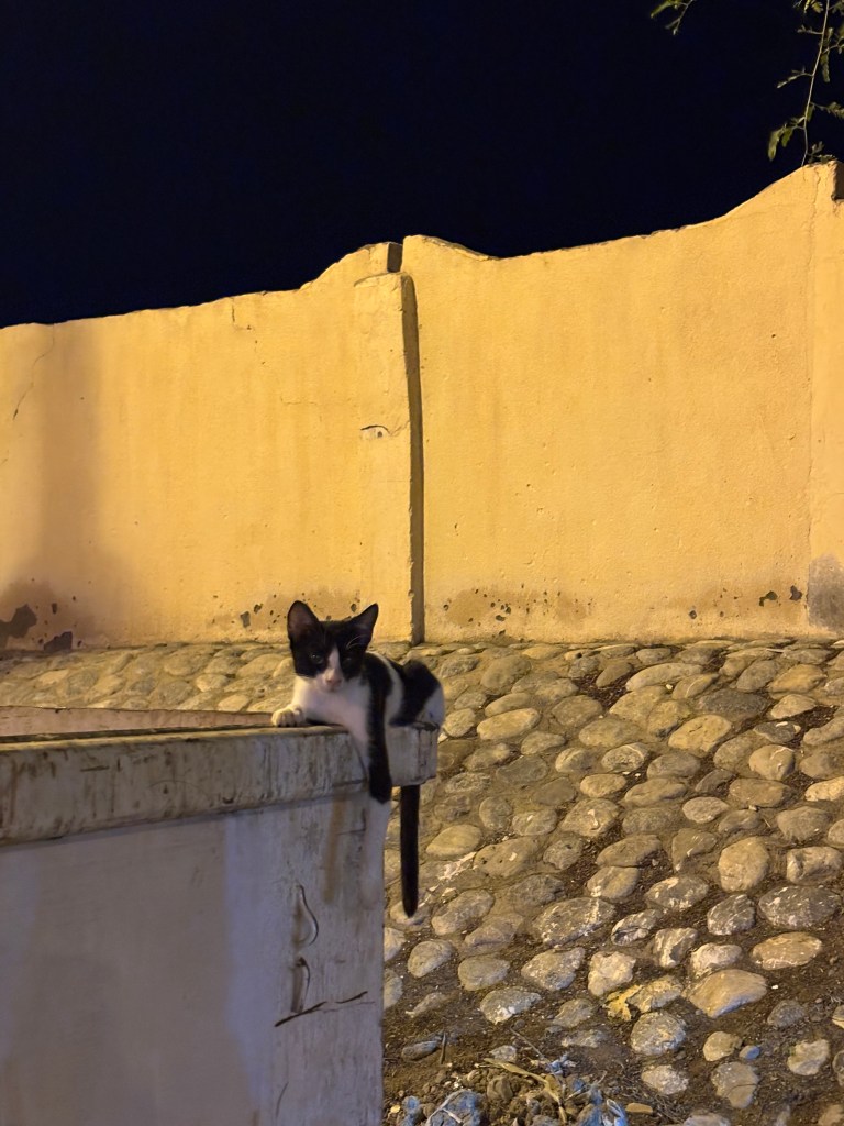 W Maskacie także spotkałam zaskakująco dużo kotów – znacznie więcej, niż się spodziewałam. Wiele z nich było przyjaznych – podążały za mną, ocierały się i szukały kontaktu. Inne, podobnie jak w Dubaju, były bardziej nieśmiałe, a czasem wyraźnie przestraszone. Niektóre wyglądały na wychudzone lub chore, co może wynikać z dużej liczby bezpańskich kotów i niewystarczających możliwości opieki nad nimi. Innym powodem może być także suchy klimat i ograniczona dostępność naturalnego pożywienia – kotom trudniej jest samodzielnie zdobywać pokarm, co wpływa na ich kondycję i uzależnia je od pomocy ludzi.