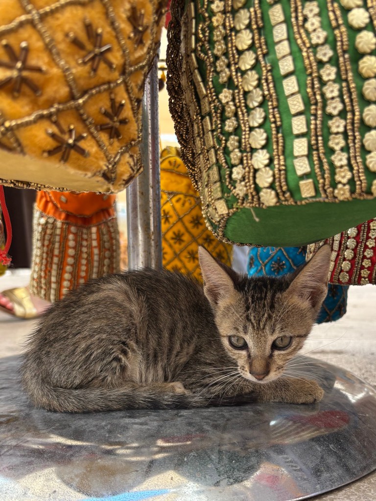 Omańskie koty urzekły mnie także swoim wyglądem. Różnią się od tych, które znamy z Europy – są smuklejsze, mają dłuższe ciała, węższe ogony i duże, wyraziste uszy. Było w nich coś poniekąd dzikiego, a jednocześnie niezwykle uroczego – trochę jak małe, pustynne zgredki.
